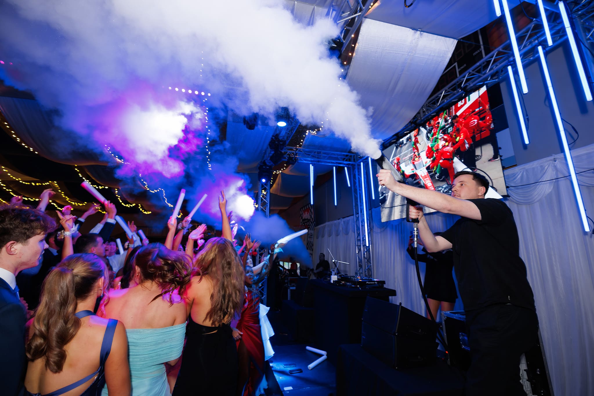 Want to make your school ball stand out? We offer a range of high-impact extras that bring serious wow factor to the night. Think confetti cannons for key moments, cold spark fountains and dry ice for dramatic entrances or special dances, and COโ blasts, bubbles, or smoke to send the energy through the roof. Add LED festoons and dynamic dance floor lighting to set the mood and complete the atmosphere.